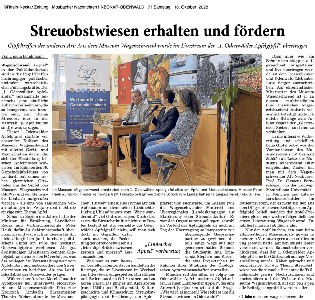 Der 1. Odenwälder Apfelgipfel begann, thematisch passend, vor den Toren unseres Museums – wo die Mitglieder des Chors HuMor frischen Apfelsaft für unsere Gäste pressten. Moderatorin Friederike Kroitzsch stellt kurz das Programm vor und Bürgermeister Thorsten Weber blickt auf die erste Hälfte des 50jährigen Jubiläums der Gemeinde Limbach zurück und präsentiert die restlichen Highlights des Jahres vor. Und bevor es danach oben im Museum mit den ersten Gästen weitergeht, blickt Kay Vonderlage noch einmal tief in die „Seele des Odenwälders“, einem hundert Jahre alten Text voller Einsichten und Überraschungen …